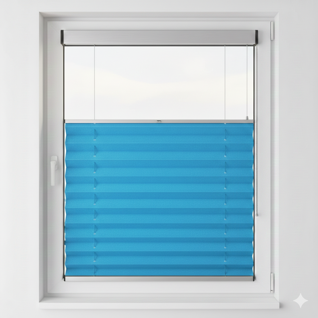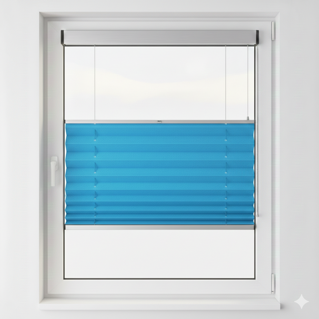 Ferah mavi plise perde ile mekanlarınıza sakinlik ve şıklık katın. Işığı dengeli süren, modern ve pratik tasarım. PLS60